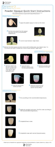 Le système de porcelaine Ceramco 3 ne verdit pas et offre un ombrage hors de la bouteille. D'autres caractéristiques de ce système incluent des pigments organiques dans les porcelaines. Les colorants brillants aident à la constitution des restaurations en réduisant le temps de formation et en permettant aux techniciens de visualiser clairement l'emplacement de chaque couche de porcelaine. Cela permet également de garantir l’exactitude de la présentation finale des nuances.