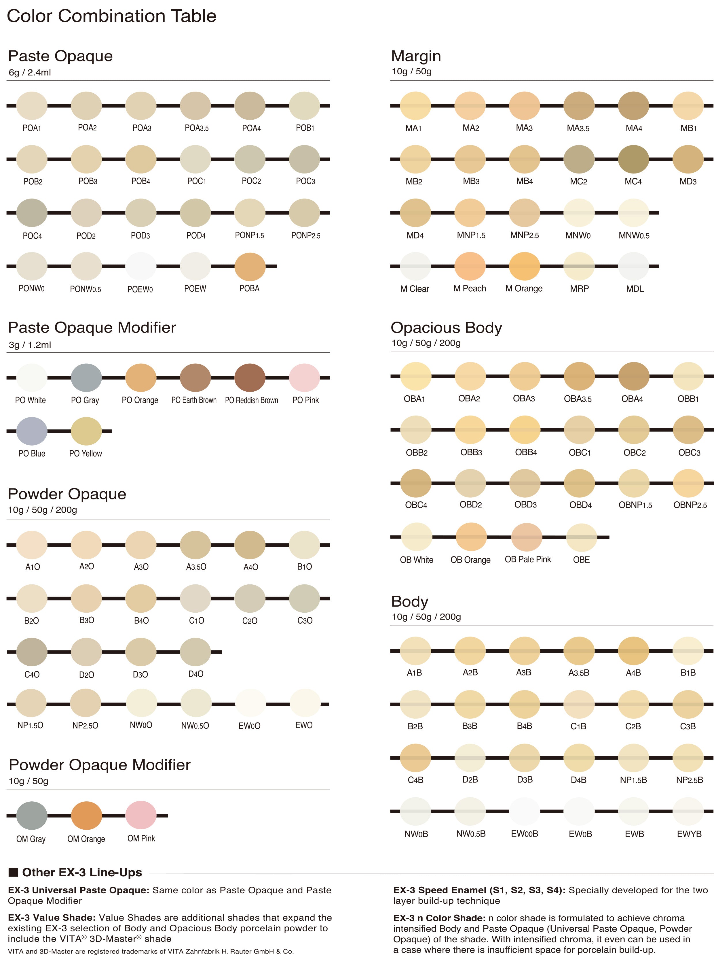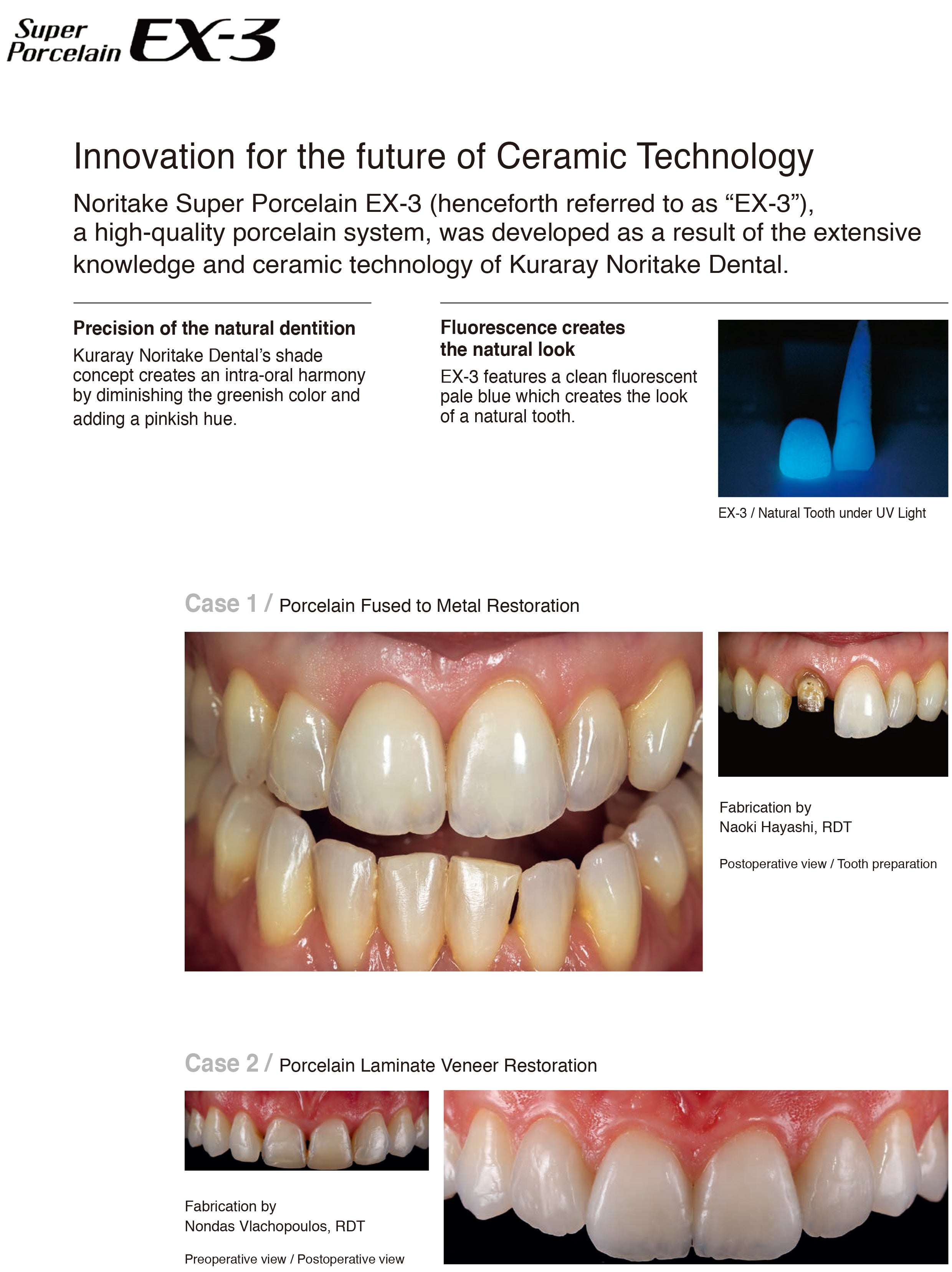 Les procédures de fabrication de NORITAKE SUPER PORCELAIN EX-3 sont remarquablement simples. Ses caractéristiques exceptionnelles sont rendues possibles grâce à sa granulométrie très fine. NORITAKE SUPER PORCELAIN EX-3 est supérieur aux autres porcelaines dentaires car son coefficient de dilatation thermique (CTE) reste stable lors de cuissons répétées. Par conséquent, lors de la fabrication d'un pont à longue portée, chaque unité peut être personnalisée avec précision grâce à des cuissons répétées de toute la portée avec un risque minimal de fissuration. Il est compatible avec les alliages précieux, semi-précieux, non précieux et sans argent pour les prothèses métallo-céramiques. Sa fluorescence est idéale et il est très résistant au verdissement induit par l'argent. Cette combinaison de caractéristiques fait de NORITAKE SUPER PORCELAIN EX-3 un choix idéal pour les restaurations en porcelaine.